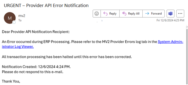 The Provider API is an MV2 application that is responsible for sending MV2 Transaction data to Business Central. If that process fails due to Business Central validation or a communications error, the Provider API will send an email to the configured email addresses.